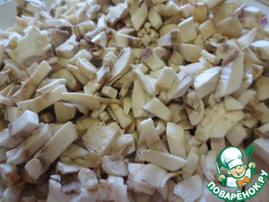 Режем грибочки. Добавляем к луку и моркови.