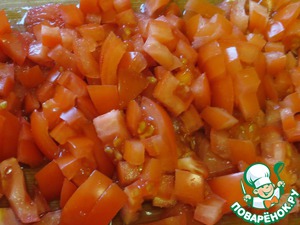 Помидор добавляем к луку, моркови и шампиньонам.