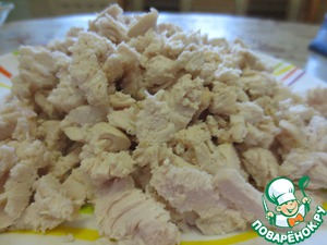 Готовое куриное филе режем на небольшие кусочки.