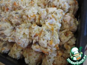Смешиваем всё - мясо курицы, рис, содержимое сковороды (лук, морковь, шампиньоны, помидор). При необходимости добавляем специи и муку.