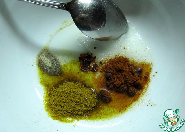 Для маринада: 2 ст. л. растительного масла, по 1 ч. л. сладкой паприки, белого перца и порошка карри, 2 ч. л. соли, чили молотый - по вкусу (взяла 1/4 ч. л.)