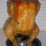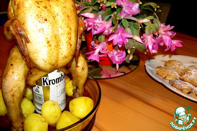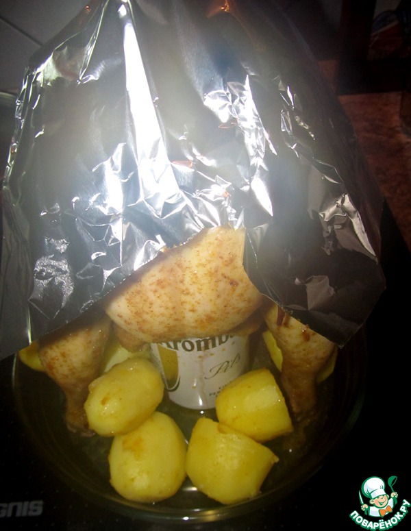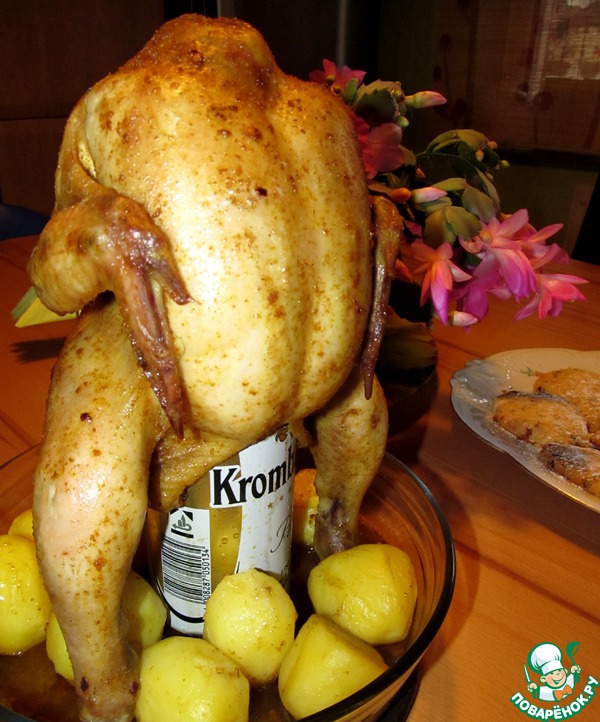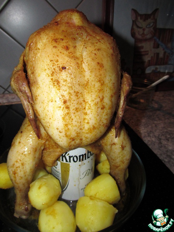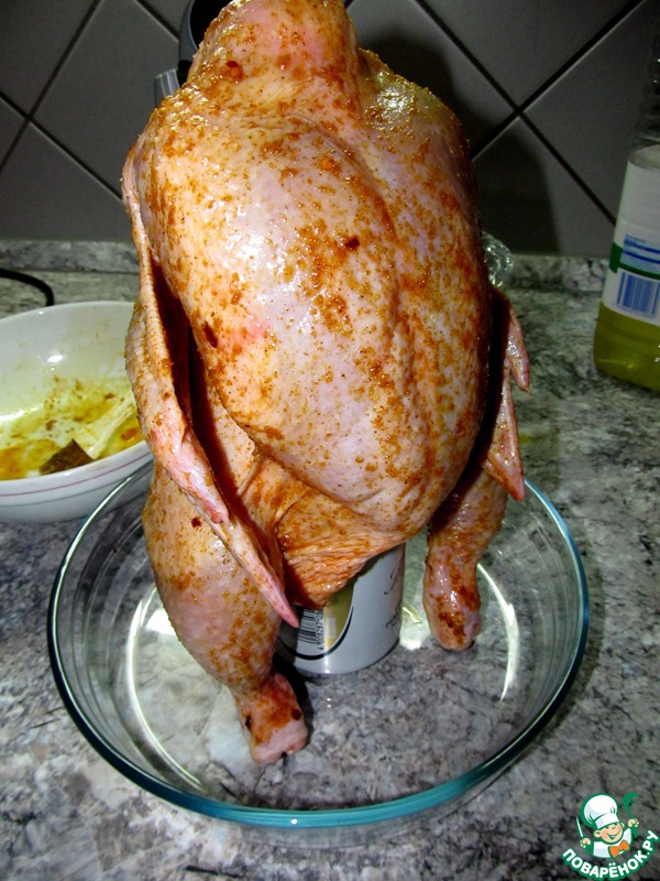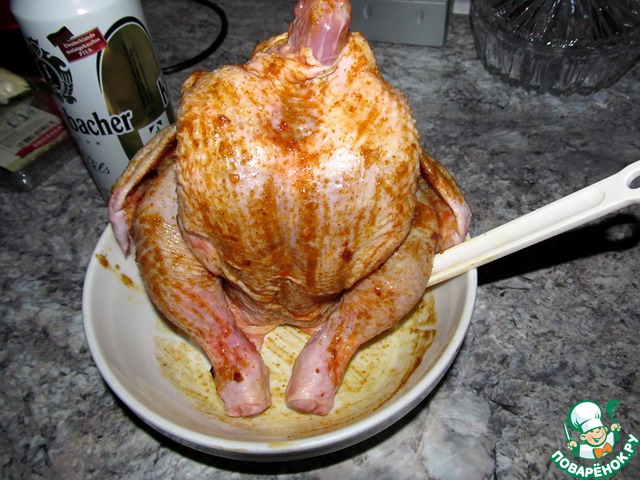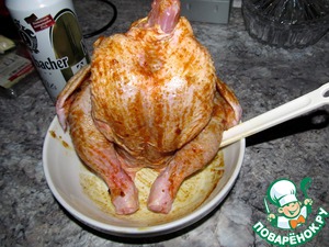Водрузить птичку важно на банку с пивом, поставить в блюдо (духовка останется чистой)