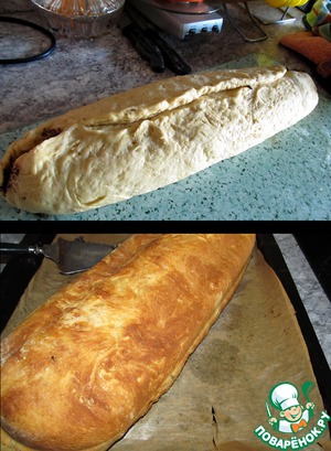 тесто раскатать, выложить начинку, оставляя края пласта свободными,