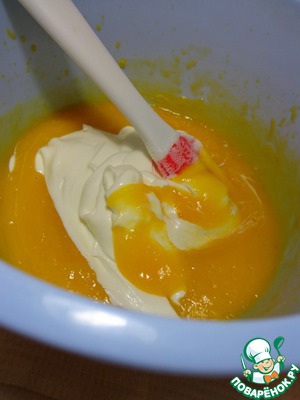 В манговое пюре добавить желатин (по описанной выше технологии) и взбитый творожок.