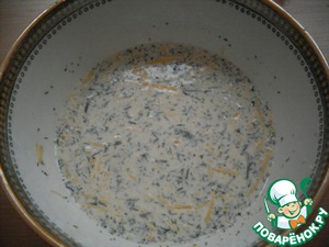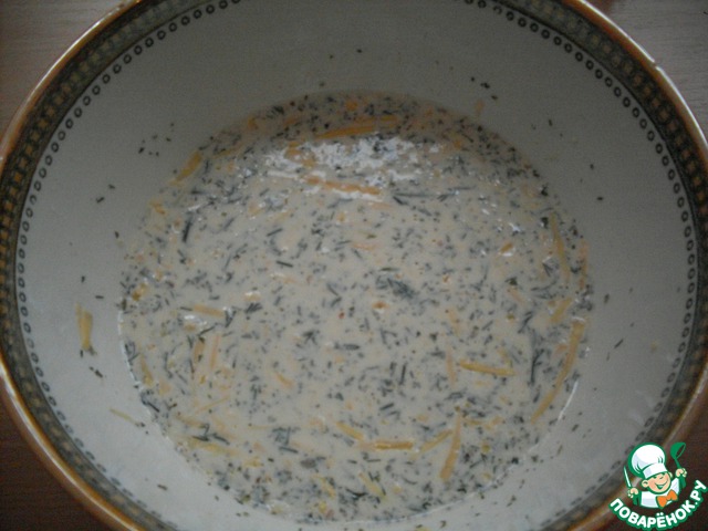 Пока варится рис, делаем соус. Мелко режем зелень, заливаем сливками, добавляем натертый сыр. Солим, перчим.