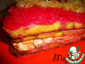 Разводим желе, как описано на пачке, заливаем в форму, в которой выпекались коржи, в центр выкладываем виноград (около 200 гр), разрезанный на 4 части.