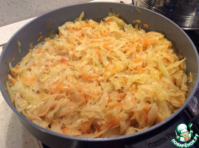 Обжаривать до золотистого цвета капусты, чтобы капуста была слегка жареная, а не тушёная. Добавить бульон и накрыть крышкой, посолить, поперчить.
