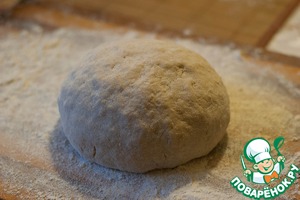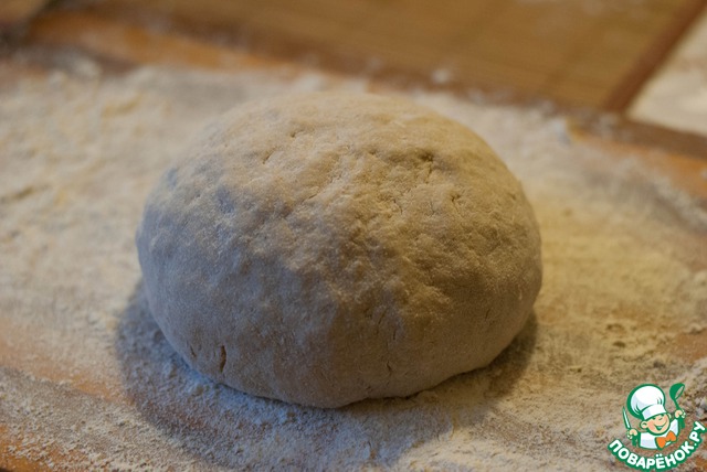 Переложить тесто на присыпанную мукой рабочую поверхность, начинайте месить тесто. Месить нужно активно, растягивающими движениями около 10-15 минут! Тесто должно стать более эластичным и гладким.