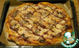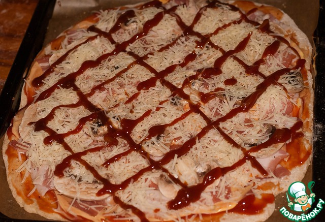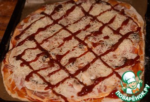 Смажьте пиццу томатным соусом и наложите выбранную вами начинку (я люблю соус барбекю + бекон + грибы + пармезан). -