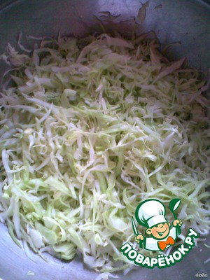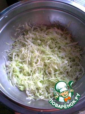 Капусту мелко шинкуем, кладем в широкую миску.