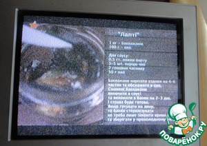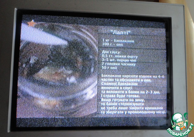 Рецепт я сфотографировала прямо с телевизора. Пропорции немного изменила, поэтому, представляю оригинальные пропорции для тех, кому быть может захочется приготовить именно так. Для тех, кто не знает украинского, перевожу: олія - это растительное масло, оцет - уксус, обсмажити - обжарить, страва - блюдо, якщо - если, не треба - не нужно, зберегати - сохранять. Все остальное должно быть понятно.