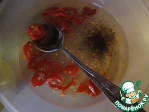 Перец нарезать тонкими кружками, добавить в растительное масло. Добавить туда же свежемолотый черный перец.