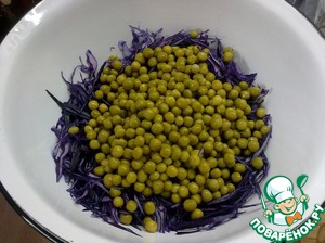 Горошек сразу можно добавить к капусте, предварительно слив жидкость.