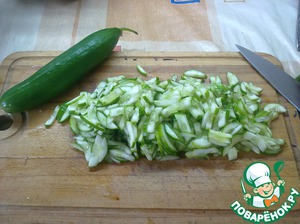 Огурчики режем соломкой и тоже в миску.