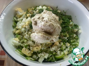 Яйца отвариваем, остужаем и режем, как душе угодно, я резала кубиками, можно сэкономить время и натереть на терке (но лучше кубиками, тогда будет видно, почему салат назван "зеленка").