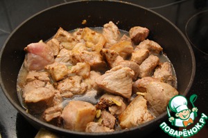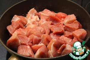 Нарежьте свинину крупными кусками. Добавьте еще немного растительного масла на сковороду и обжарьте мясо до светло-коричневого цвета. Переложите в отдельную миску.