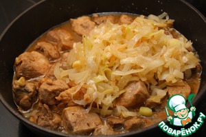 Добавьте в сковороду мясо, 1 стакан воды, посолите, накройте крышкой, доведите до кипения и оставьте тушиться на медленном огне 45 минут.