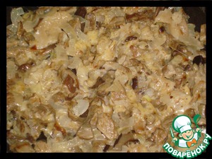 Грибы мелко нарезаем и кладём на разогретую сковороду. После того, как испарится жидкость, добавляем сливочное масло и мелко нарезанный лук. Когда лук будет готов, добавляем сливки (сметану), тушим минут пять, солим, перчим и выключаем.