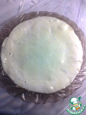 По оригиналу нужно сделать так: холодную сковороду смазать растительным маслом. Влить в сковороду 3 белка, посолить. Поставить сковороду в духовку с водяной баней при 80 С на 8 минут. Я сделала по своему: сковороду смазала раст. маслом, чуть прогрела, поставила на рассекатель, вылила три белка (не перемешивать), на маленький огонь (чтобы они не жарились, а парились). Готовые белки переложила на тарелку, застеленную пищевой плёнкой.