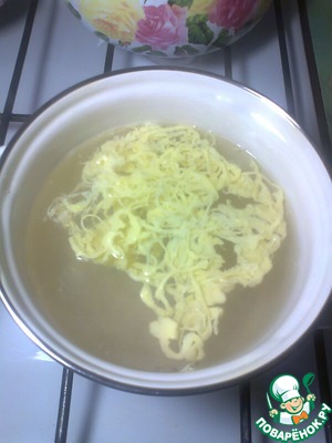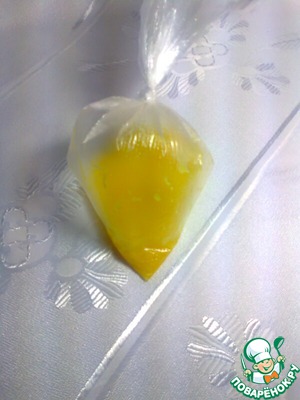 У нас остался один желток, это для декорирования нашего омлета. Опять же слова автора: воду в кастрюле довести до кипения. Желток поместить в корнет из пергаментной бумаги. Я вместо пергаментной бумаги хорошо размешаный желток поместила в полиэтиленовый пакет (в уголок).