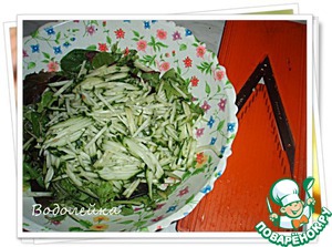 Огурцы помыть и порезать соломкой. Я использовала для этого вот такую терку с насадкой.