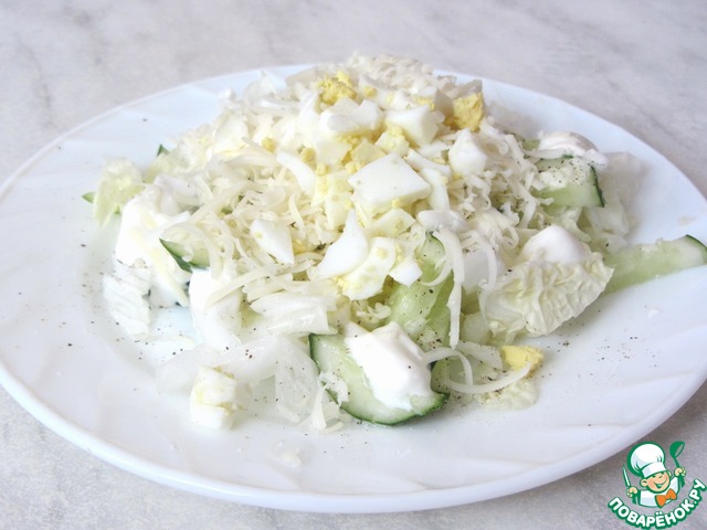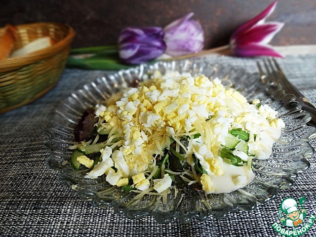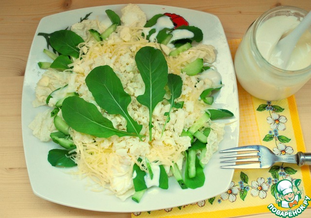 Выкладываем салат в салатницу, на салат- йогурт... Его количество - по желанию.