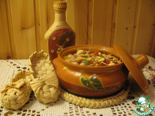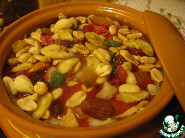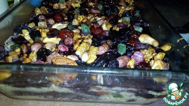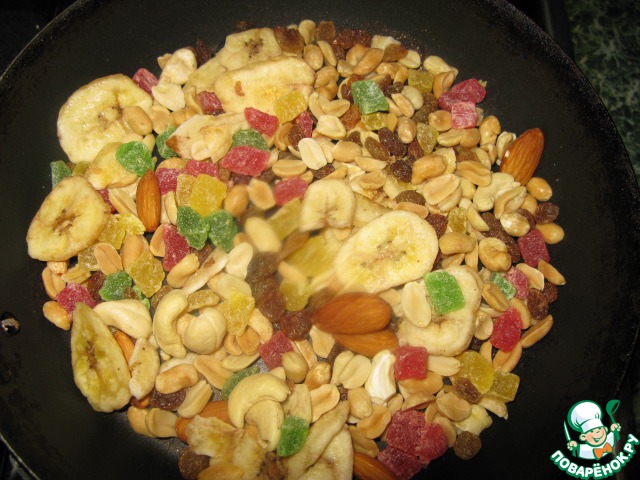Орехи, изюм, цукаты ошпарить кипятком и прокалить на сковороде. (Я брала готовую смесь орехов и сухофруктов с цукатами).