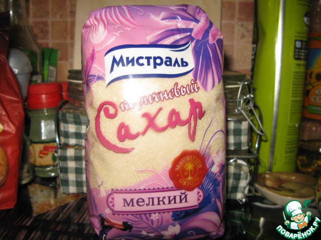 В сливки, оставшиеся после получения пенок, всыпаем сахар и манку. Я беру сахар ТМ Мистраль коричневый мелкий.