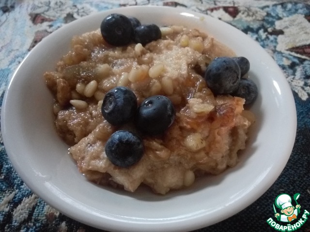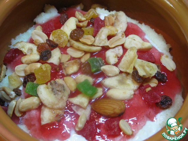 Ставим в духовку, разогретую до 180 градусов, на 20 минут. Вытаскиваем и посыпаем орехами, цукатами, изюмом.