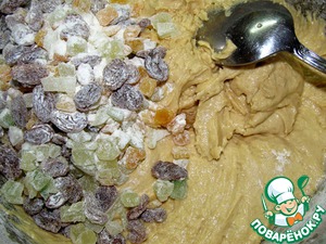 Засыпать изюм и цукаты. Перемешивам уже ложкой.