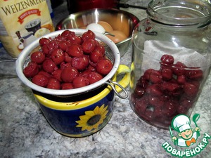 Вишню откидываем на сито, обсушиваем, пересыпаем мукой.