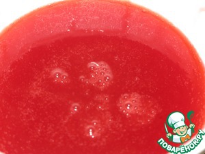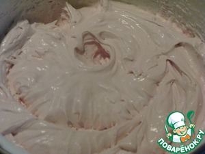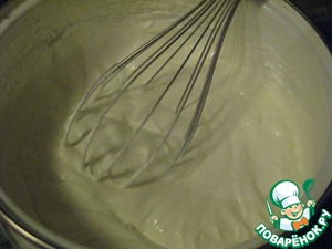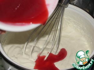 Продолжая взибвать, постепенно влить сок (где-то 80 мл). Остальной сок оставить для поливки десерта.