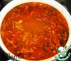 Кладем огурцы, перловку и поджарку. Варим еще 5 минут. Добавляем полстакана вареного рассола, чеснок, лавровый лист, зелень. Даем еще покипеть 3 минуты, выключаем.