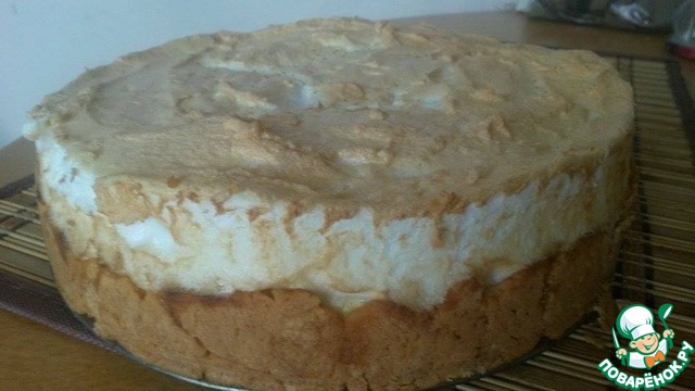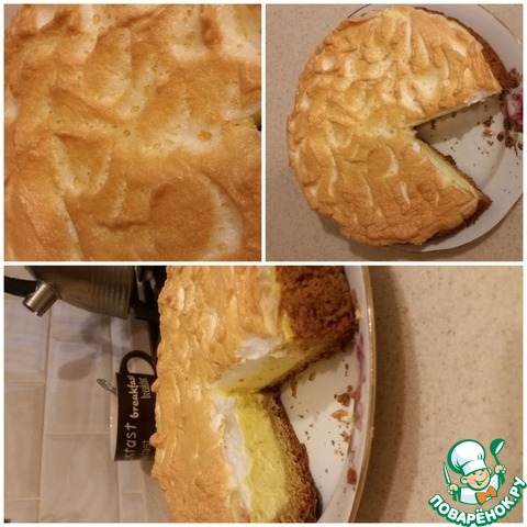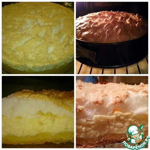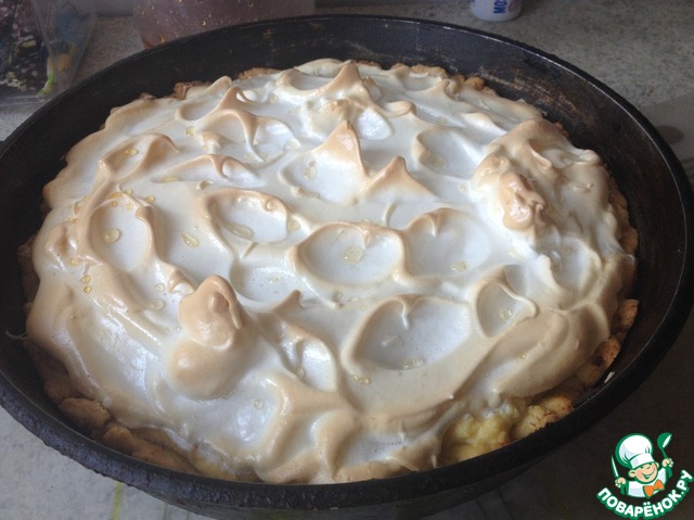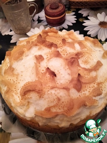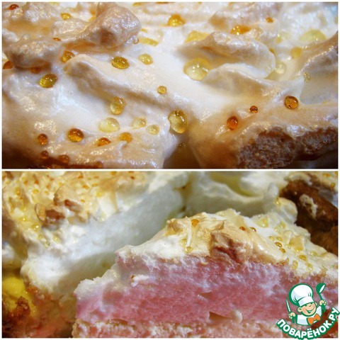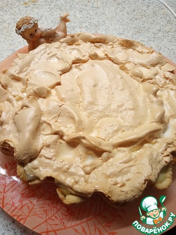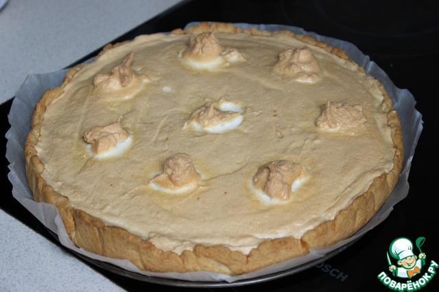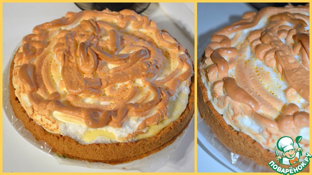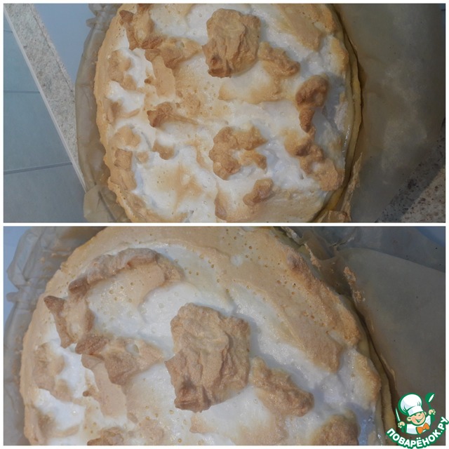 Через 20 мин достаём из духовки десерт, выкладываем по верху ровным слоем взбитые белки, я ещё украсила из белков небольшими завитушками. Отправляем десерт снова в духовку до золотистого цвета, на 10-15 минут, не больше, чтоб не пересушить суфле.