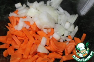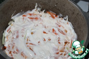 • Сверху выкладываем часть пассeровки из лука и моркови.
