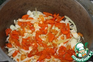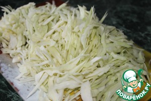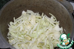 • В кастрюлю укладываем половину нашинкованной капусты.