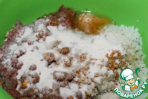 • Замешиваем фарш, добавляя яйцо, манку, соль, специи.