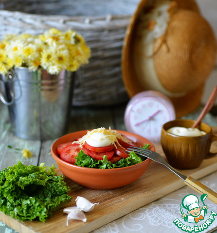 Чеснок выдавить через чеснокодавилку к помидорам, посолить, поперчить по вкусу. Заправить майонезом, хорошо перемешать.