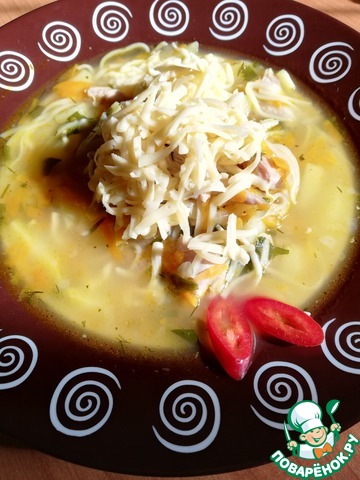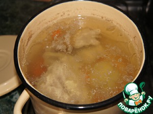 Для приготовления супа можно использовать воду, а можно и бульон. Я варила курицу для салата, добавила луковицу и морковку, получился шикарный бульон.
