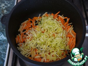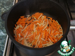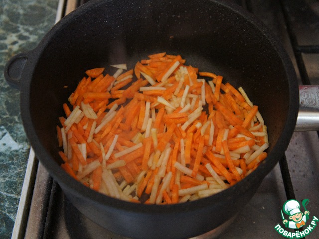 Лук измельчить, корень петрушки или сельдерея и морковь нарезать тонкой соломкой. В растительном масле спассеровать морковь с сельдереем,