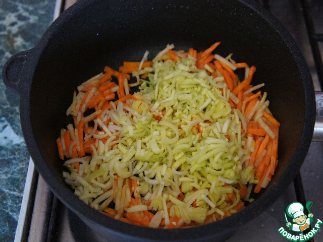 Добавить порей и пассеровать еще 1 минуту. Если используете репчатый лук, можно пассеровать все вместе.