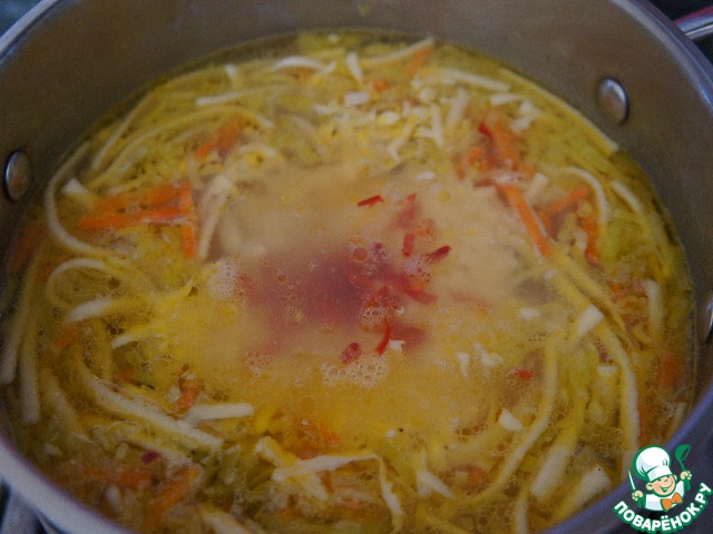 В готовый суп добавить измельченный острый перец (несколько тонких колечек отрезать для украшения), нарезанную зелень и тертый сыр. Перемешать.