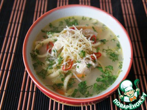 При подаче в тарелки налить суп, посыпать мелко нарезанной зеленью, украсить колечками острого перца и сверху добавить щепотку натертого на мелкой терке сыра.