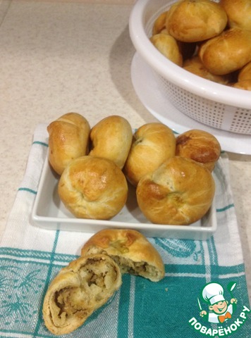 Отварной картофель помять, добавить, сливочное масло, обжаренный лук, поперчить, если надо посолить. Оставить остывать.