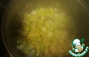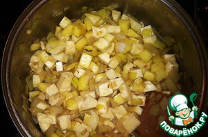 Лук режем кубиками и обжариваем с мелко порезанным чесноком на сл. масле в кастрюле с толстым дном или на сковороде, я делаю и так, и так. До мягкости.