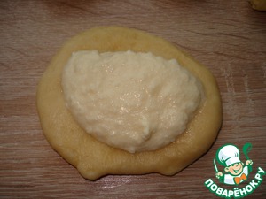 Руками разминаем каждый кусок теста, кладем на середину 1 ст. ложку начинки.