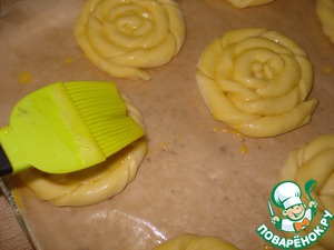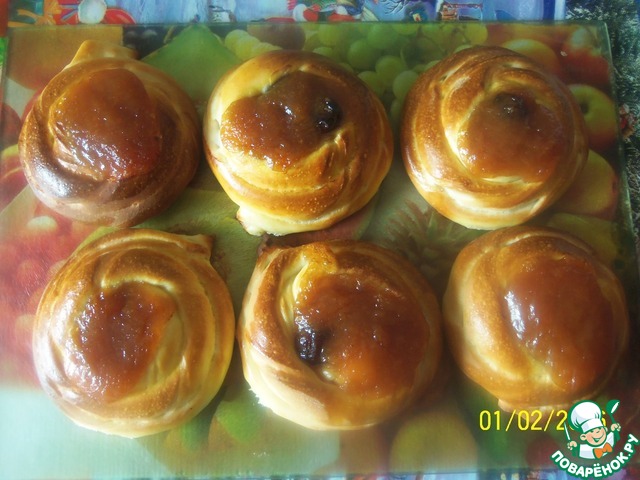 Продавите в центре спиралек ямки и выложите начинку. Поставьте на расстойку в теплое место на час. Выпекайте при 200 °С.