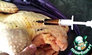 Мед. шприцом нашпиговываем индейку в районе грудки и вообще везде, чем больше, тем лучше. Оставляем на 3-4 часа.