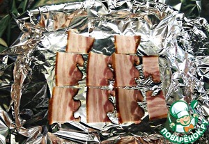 Кладём в противень на подушку из грудинки и неплотно заворачиваем в фольгу.