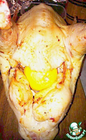 Полученным соусом обильно натираем птичку, я связал лапки, т. к. не проходила по высоте.